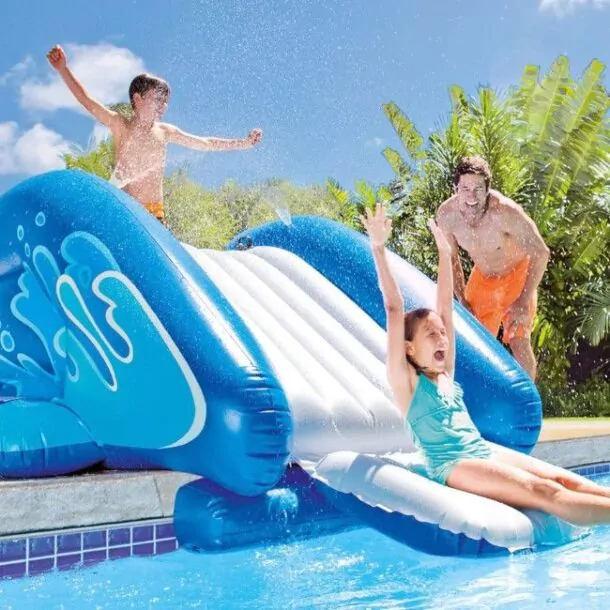 Deze stoere glijbaan is perfect voor kinderen, vriendjes en ouders die willen genieten van waterpret. De glijbaan heeft handgrepen voor optimale veiligheid. Afmetingen: 333 x 206 x 117 cm. Wordt geleverd inclusief reparatiemateriaal, Geschikt voor kinderen vanaf 6 jaar.